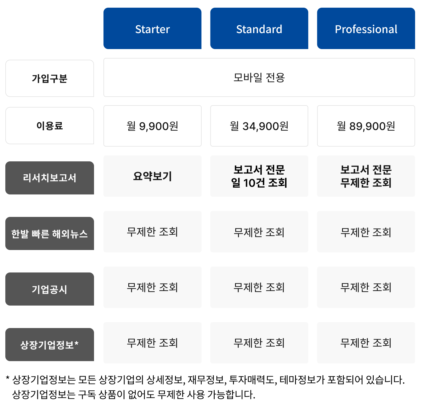 인앱 구매 가능했던 1개월 이용권은 출시와 함께 판매 중단되지만 새로 출시될 Professional Plan 요금제와 이용 범위가 동일합니다. 단, 앱 전용 요금제이므로 앱으로만 콘텐츠 조회가 가능합니다. 주로 앱에서 간편하게 리포트를 읽으신다면 Professional Plan은 기존 인앱 이용권보다 약 65%(얼리버드 할인가격 기준) 저렴하게 이용하실 수 있으니 많은 이용 바랍니다.